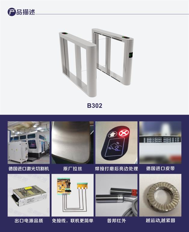 機(jī)場_速通門B302功能特點(diǎn): 1. 進(jìn)口304不銹鋼; 2. 箱體激光切割加工; 3. 精焊,精磨工藝; 4. 表面原廠拉絲; 5. 紅外防夾保護(hù); 6. 非法闖入紅外報警; 7. 刷卡開閘反向逆行報警; 8. 凈重:單機(jī)芯:45kg, 雙機(jī)芯:85kg;