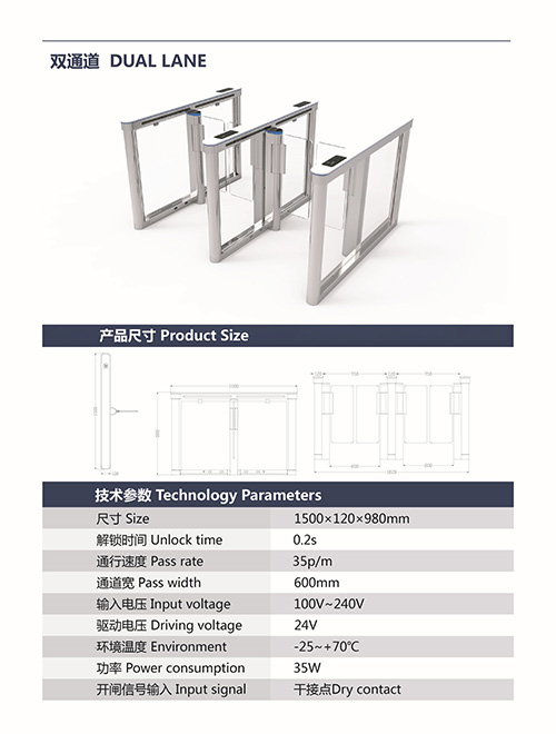 1.速通門B307系統(tǒng)具備防撞功能,當(dāng)有外物在未授權(quán)的狀態(tài)下撞擊擺桿,擺桿運(yùn)動角度達(dá)到菜單設(shè)定的值(如 2°),控制器_會啟動剎車機(jī)構(gòu),阻止擺桿運(yùn)動,并啟動聲光報警。當(dāng)外力進(jìn)一步增大,剎車控制器會保護(hù)擺桿不被撞斷,外力撤除后,擺桿自動歸位,系統(tǒng)正常; 2.速通門B307統(tǒng)具備角度分辨和零位自檢功能,包含 500P/R 編碼器,分辨精度高,這種高精度的傳感器的優(yōu)勢是使擺桿轉(zhuǎn)動_; 3.非法進(jìn)入有報警提示功能; 4.防沖功能,在沒有接收功能開閘信號,擺臂自動鎖死; 5.紅外防夾功能,在擺臂復(fù)位的過程中紅外檢測到人在通道中,擺臂會自動回到打開狀態(tài); 6.統(tǒng)一標(biāo)準(zhǔn)的對外電氣接口,可與多種讀卡器相掛接,并可通過管理計算機(jī)實現(xiàn)遠(yuǎn)程控制與管理; 7.速通門B307系統(tǒng)設(shè)有過流保護(hù)裝置,當(dāng)負(fù)載_過某設(shè)定值(如 2._),系統(tǒng)停止工作,以免燒壞電機(jī)等設(shè)備;